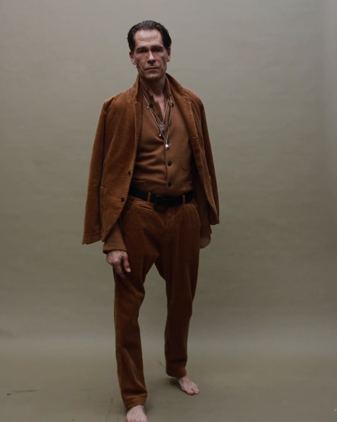 Details Lange herenbroek met rechte pijp, gemaakt van blauwe ribstof. De broek is voorzien van een tailleband met riemlussen, verborgen knoopsluiting en voor- en achterzakken.